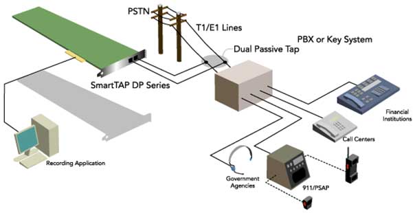 blueButler can tap the T1/E1 digital trunks that connect to your PBX with single-span or dual-span tap cards for trunk-side recording of incoming and outgoing calls. Each of the T1/E1 Tap cards is installed in the blueButler Windows server and connects to the T1/E1 with a standard RJ45 splitter inserted onto the line. Up to 16 cards can be installed in each server and multiple servers can be clustered together providing unlimited scalability.